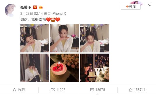 张馨予也在生日当天晒出一组照片配文:“谢谢,我很幸福。”