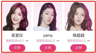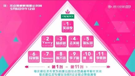 目前的前十名是这样的第一吴宣仪,第二yamy,第三名杨超越,第四孟美岐,第五强东玥,第六段奥娟,第七Sunnee,第八陈芳语,第九李子璇,第十傅菁,第十一李紫婷