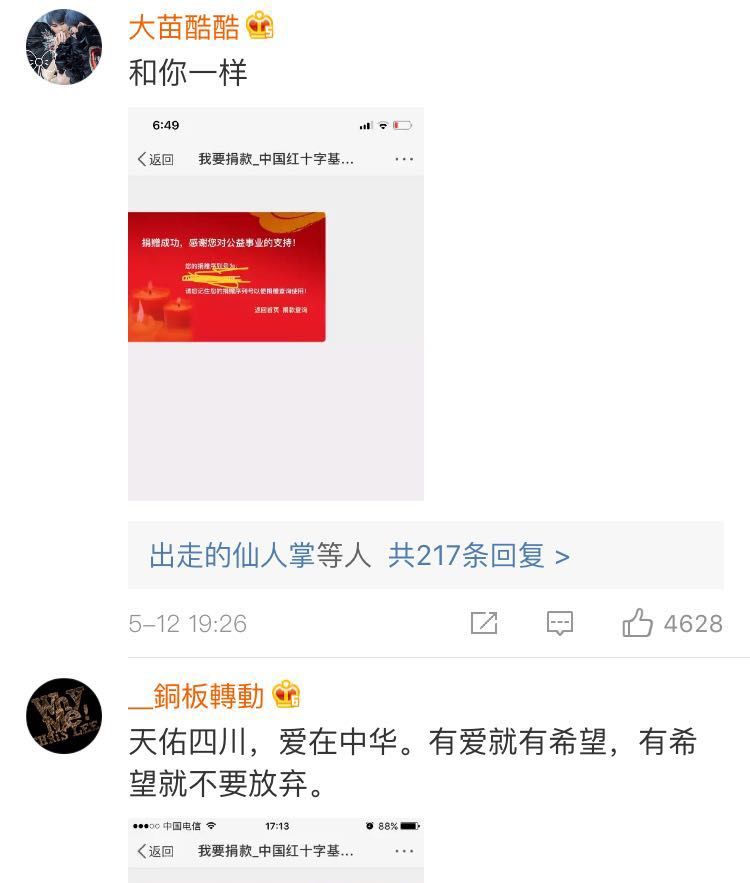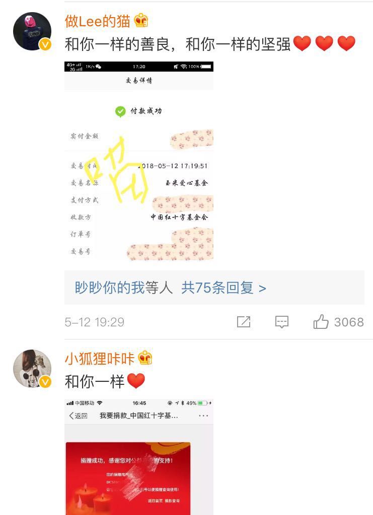 在前天“5.12”纪念日上,李宇春发博悼念,随后粉丝们纷纷自发捐款,并在评论中晒出捐款记录,用李宇春歌曲《和你一样》中的歌词留言,“我和你一样,一样的善良,一样为需要的人打造一个天堂”