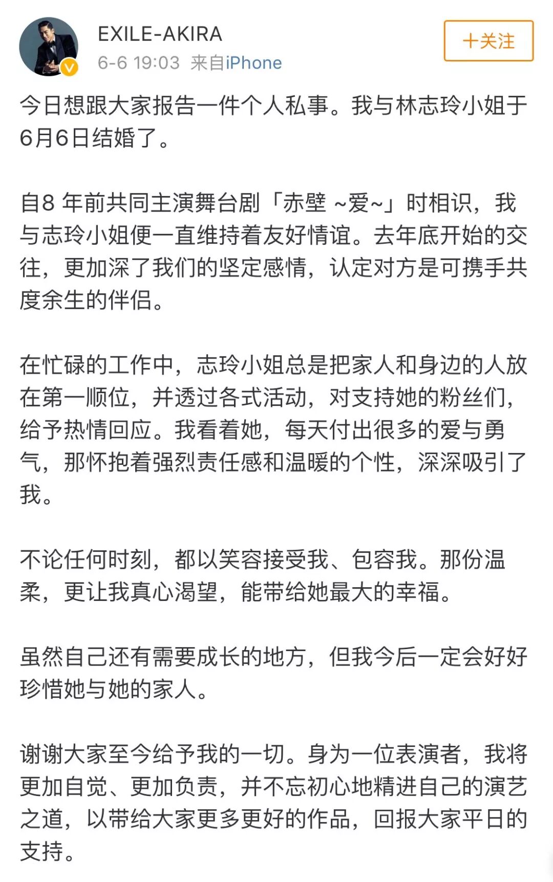 8年前,AKIRA与林志玲共同主演舞台剧《赤壁·爱》时相识,去年底开始交往,今年6月6日结婚,节奏也是相当迅速,毫不拖泥带水。