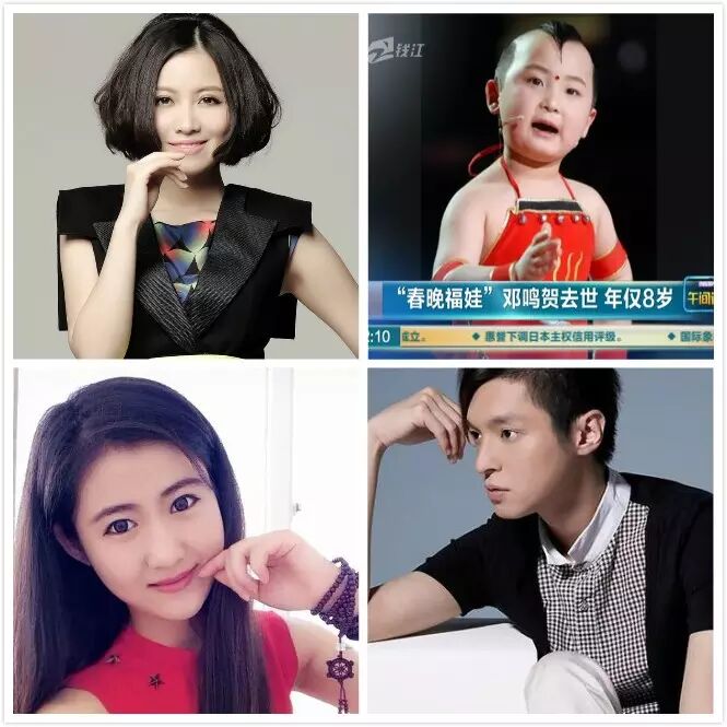 邓鸣贺:2013年登上中央电视台春节联欢晚会。2015年4月28日因白血病复发,抢救无效逝世,年仅8岁 。