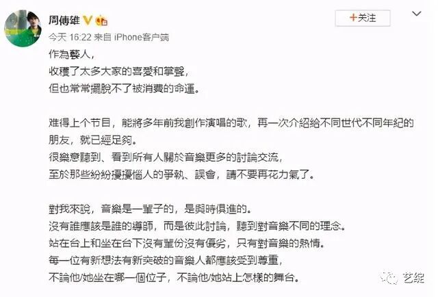 2月2日下午,周传雄也发文回应此事,他表示:“没有谁应该是谁的导师,站在台上和坐在台下没有辈分没有优劣,只有对音乐的热情。”