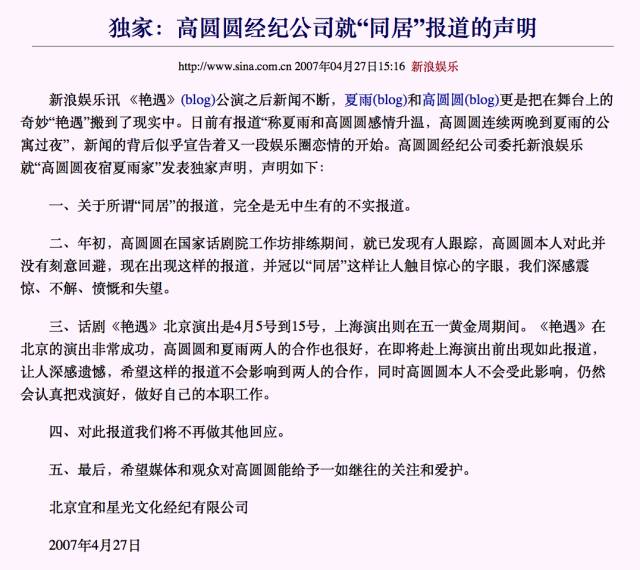 一时间,高圆圆的清纯形象瞬间破灭。之后她的经纪公司发出了一纸声明,表示“同居”完全是无中生有的不实报道。