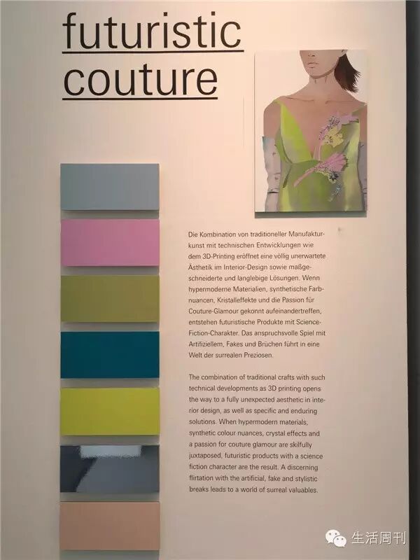 “未来主义”表达的是一个有着科幻小说特色的超现代化社会。产品由塑料、有机玻璃、石灰岩、金属和氯丁橡胶等制作而成。3D打印技术与传统工艺相结合,开启新的设计审美方式。新材质、新颜色的大胆运用,呈现出科幻感十足的产品设计。仔细研究这系列的色谱图,你会发现发布者很可能是从女性春夏时装中得来的灵感。轻快的材质和有荧光色泽的粉嫩色系,都给人一种非常愉悦的情绪,而透明材质的大量运用,更让这种风格充满年轻俏皮的味道。