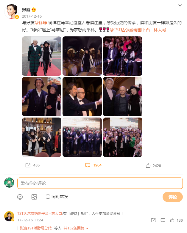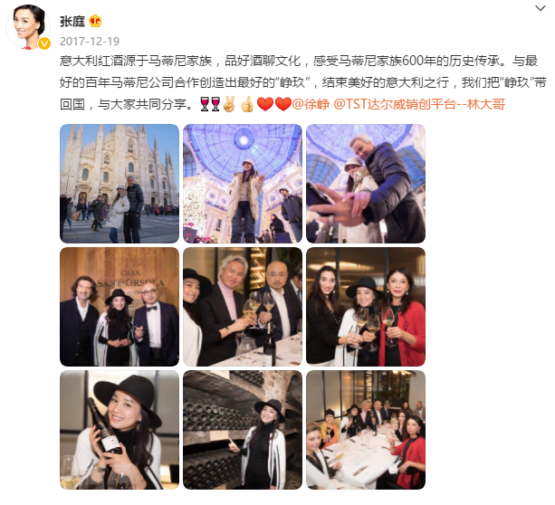 通过微博也可查询到,2017年张庭与徐峥曾共同前往意大利品尝红酒并参加活动,张庭曾在微博文案中提及“峥玖”品牌。