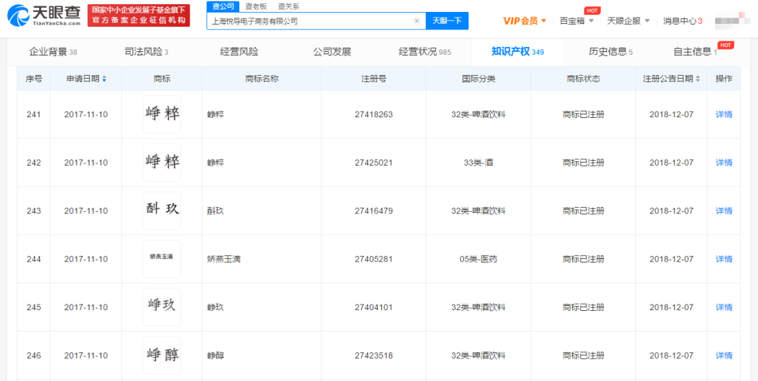 天眼查App显示,TST关联公司上海达尔威贸易有限公司全资子公司上海悦导电子商务有限公司,于2017年申请注册多个“峥玖”“峥醇”“峥粹”“峥臻”“峥嵘”商标,国际分类涉及酒、啤酒饮料,除“峥嵘”商标为无效状态,其他商标均为已注册。