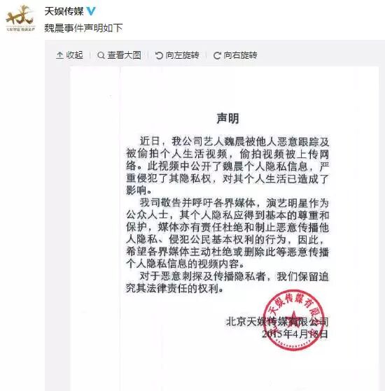 4月15日晚间,魏晨的经纪公司“天娱传媒”在微博发文,怒斥偷拍者,并称将保留追究法律责任的权利。