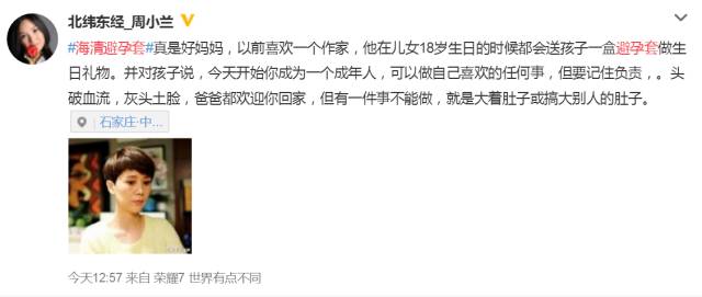 海清:我就是想如果我的孩子到了这个年纪这么大,如果出去我一定会给她准备啊,对别人负责对自己负责,我觉得十五六岁的孩子他们都能接受的,大部分的孩子,而且我觉得没有什么好遮掩的,因为我觉得遮掩不说,等到真的出事了就出大事了。