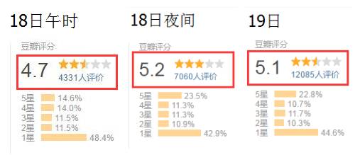 豆瓣观众评分经历了从开播次日午时的4.7,六小时后激增到5.2后,再到今天暂时稳定在5.1的跌沓起伏。