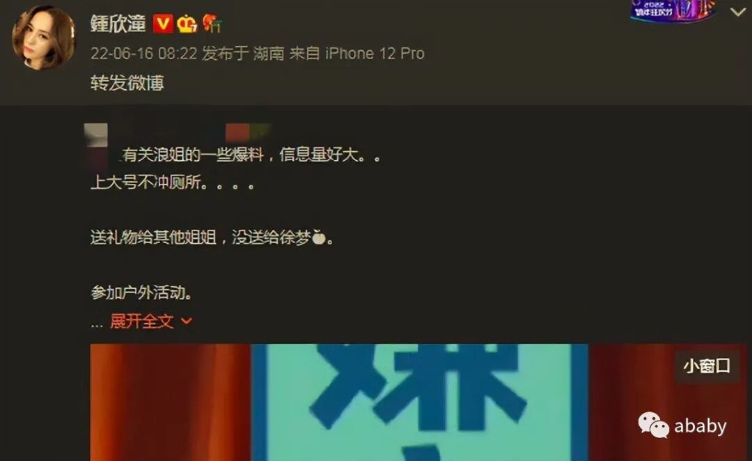 钟欣潼转发的这条动态是说《浪姐》里边的一位嘉宾在节目中的奇葩表现,信息量相当大,而且对这位艺人的种种描述,都在暗示这个人疑似是赵樱子。