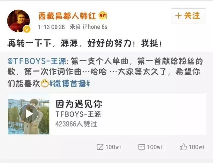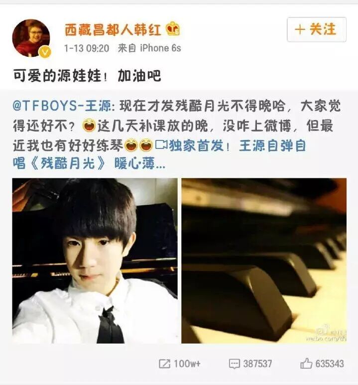 还记得韩红姐姐零点前说她的干儿子也在台上吗?小编还记得去年跨年她夸源源可爱,微博也关注了源源,并且为源源的原创单曲和钢琴弹唱曲转发了呢!小编不得不猜想一下,韩红姐姐说的这个干儿子,会不会是我们源源呢?不管是不是,韩红姐姐的爱,我们都看到了呢!
