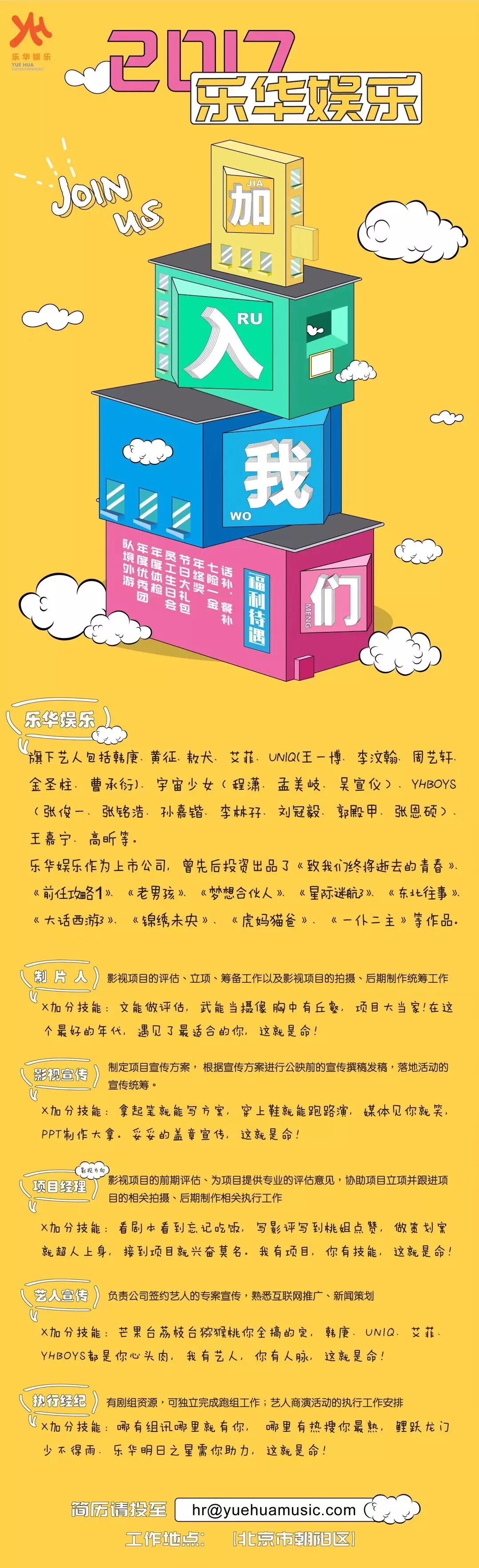 你离韩庚还差一份简历的距离!乐华娱乐5大职位招聘! 娱乐招聘指南 内地男星 2017-11-02 21:48:07 667 创作不易,用心坚持,欢迎请BaGua喝几杯爱心咖啡!打赏并支持本文 打赏并删除本文 招聘单位:乐华娱乐招聘职位:制片人、影视宣传、项目经理、艺人宣传、执行经纪工作地点:北京应聘方式:[email protected]招聘详情如下点击“阅读原文”,查看更多往期招聘 创作不易,用心坚持,欢迎请BaGua喝几杯爱心咖啡!打赏并支持本文 打赏并删除本文 感谢您的支持鼓励,我会继续努力的!文章地址:用户邮箱:打赏金额:USDT 请输入数字点击”去打赏“,即可进行打赏支持本文章哦 韩庚 About the Author 娱乐招聘指南 功能介绍:每天告诉你进入娱乐圈的各种姿势!(独家一手的娱乐产业招聘信息)关注我,距离娱乐圈更进一步。 Related Posts 乐华娱乐大招聘!韩庚程潇孟美岐吴宣仪王一博范丞丞的公司 2019-02-22 18:41:27 姚晨公司坏兔子影业招聘资深艺人宣传! 2018-11-12 18:54:03 尚雯婕迪玛希公司 黑金音乐招聘经纪人、宣传、企划! 2018-10-06 13:05:08 黄小蕾公司统和天成影视招人啦!艺人宣传快到碗里来,等你加入喔~ 2018-09-17 16:15:12 黄英工作室招聘啦!脑洞大活又好的朋友看过来~ 2018-08-16 17:46:50 发表评论