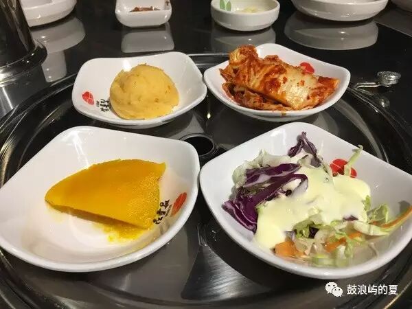 前菜小点,你一定会跟我一样看错的吧。哈哈,是南瓜哦,是土豆红薯泥哦。泡菜居然是今天早上空运的,老板,给姐空运一个欧巴好吧?不用金秀贤,只要宋仲基就行,哈哈。南瓜块是蒸好的,以为是芒果,好吧,不是吃印尼菜,哈。不过也很清新爽口。土豆红薯泥,从来没有这么混搭,真的好好吃,还以为有胡萝卜,好吧,最近吃太上火,眼瞎,哈。水果沙拉就没开动,因为一会儿我知道我会疯狂吃肉,因此这个解腻好东东留下了。泡菜非常入味,而且脆爽,空运的非常给力呀。