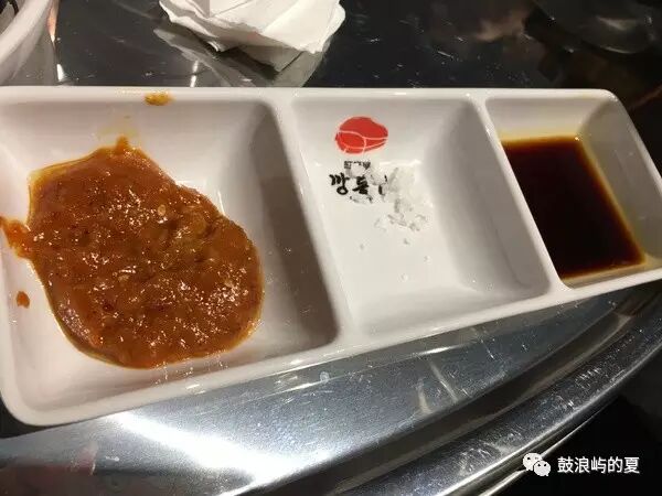看着眼前三样小配料,都有点想吃的尝了下,肉肉没来,先看调味好了。辣酱,呃,不太算辣酱,应该是烤肉酱,咸咸可口。椒盐,不用尝,还有一个是酱油。