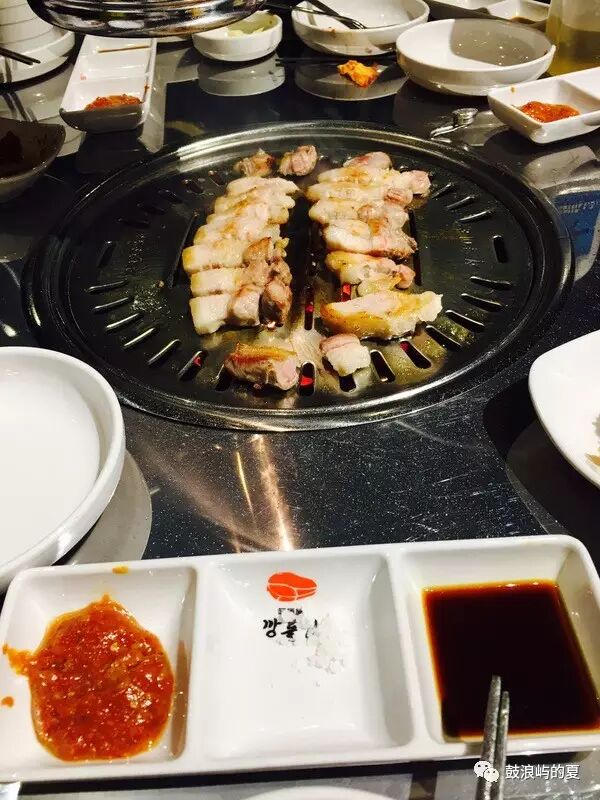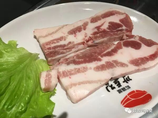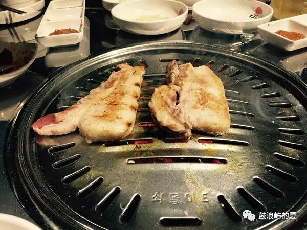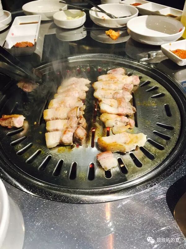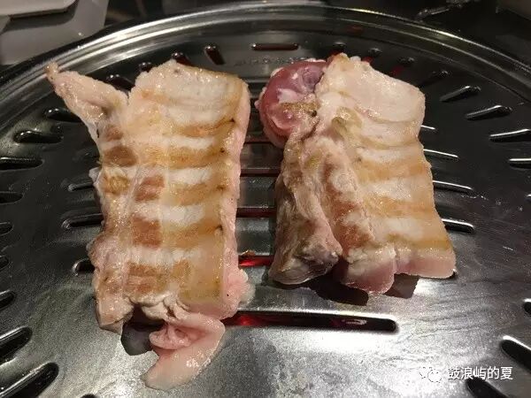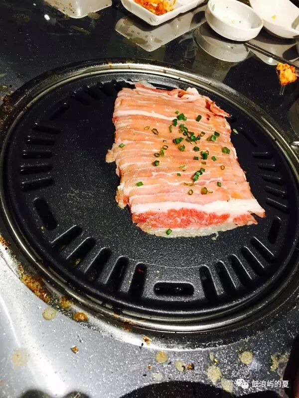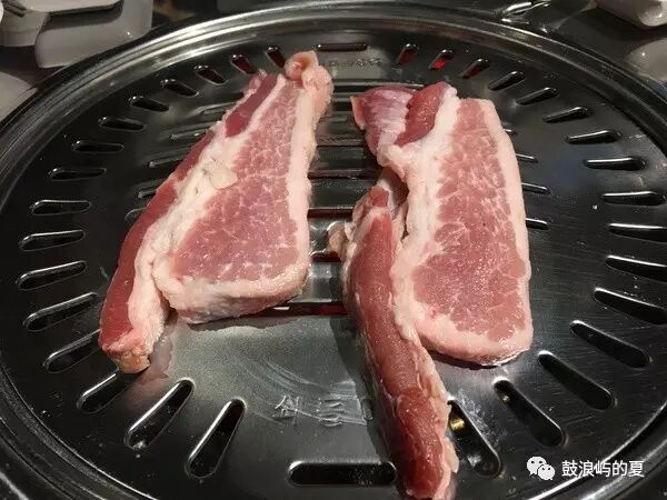 本场第一个上场,而且非常有韩国感的五花肉,厚厚的上场了。不锈钢的烤盘,听见噗呲噗呲噗呲的声音,真的好带感哦,胃都开始准备冲五档了,哈。
