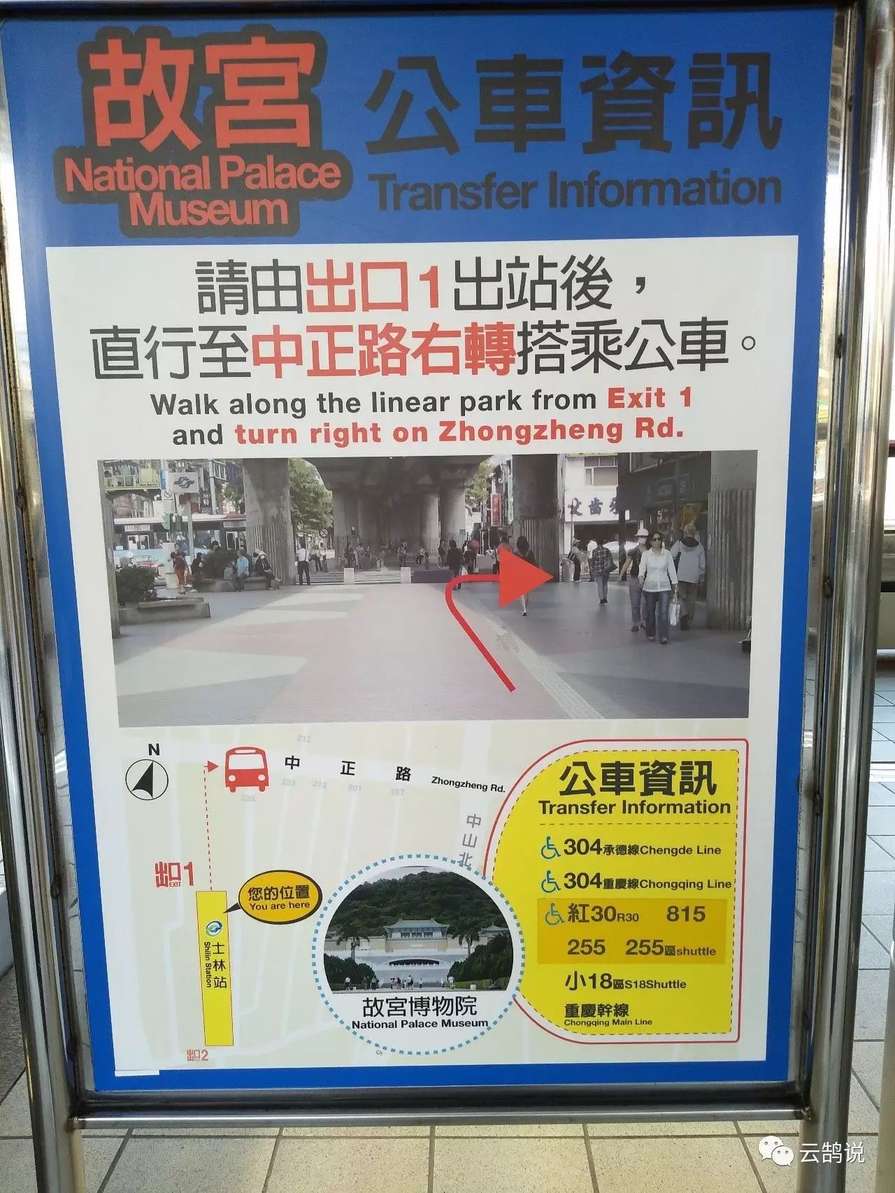 去故宫很方便,直接坐红色淡水信义线。捷运一样不用安检,但淡水信义线一般都会很拥挤,尤其是上下班时期,台北人行色匆匆,所以记得电梯靠右站,方便其他人。台车到故宫博物院6站,在士林换乘公交。中正路1出口直走右转就是公交站,公交上车不用刷卡,下车再刷卡感应。有些客运上下车都要感应,不清楚的还是先问一下司机。