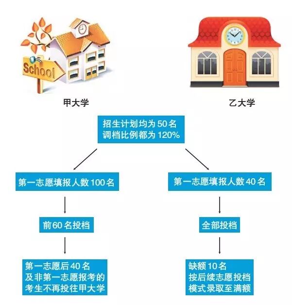 如图所示,甲乙两所大学当年的招生计划均为50名,第一志愿填报甲大学的考生共有100名;第一志愿填报乙大学的考生40名,两校的调档比例都为120%(按照规定,在川招生的高校顺序志愿投档比例一般在120%以内)。甲学校的第一志愿填报人数远超过招生计划,按照填报考生的成绩高低,将成绩前60名考生的档案投给甲学校,供学校审录,同时,由于在第一志愿已经录取满额,即使第二志愿中未出档的考生的分数高于第一志愿调档的考生的分数,依据志愿优先原则,第二志愿的考生将没有机会投向甲学校;而由于第一志愿填报乙大学的考生不足50名,所以全部调档,不足的计划将继续从第二志愿中录取。若第二志愿仍为顺序志愿,则将前12名考生的档案投向乙学校,供学校审录;若为平行志愿,余下名额则按平行志愿模式投档。