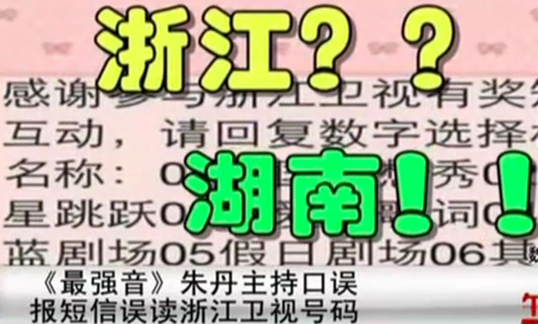 朱丹口误,字幕组也没有及时校正。随后,有观众按照这个号码发了短信,收到的是浙江卫视《我爱记歌词》自动回复的信息,导致湖南卫视短信互动资费损失惨重。之后,朱丹惨遭封杀,从此慢慢步下神坛。