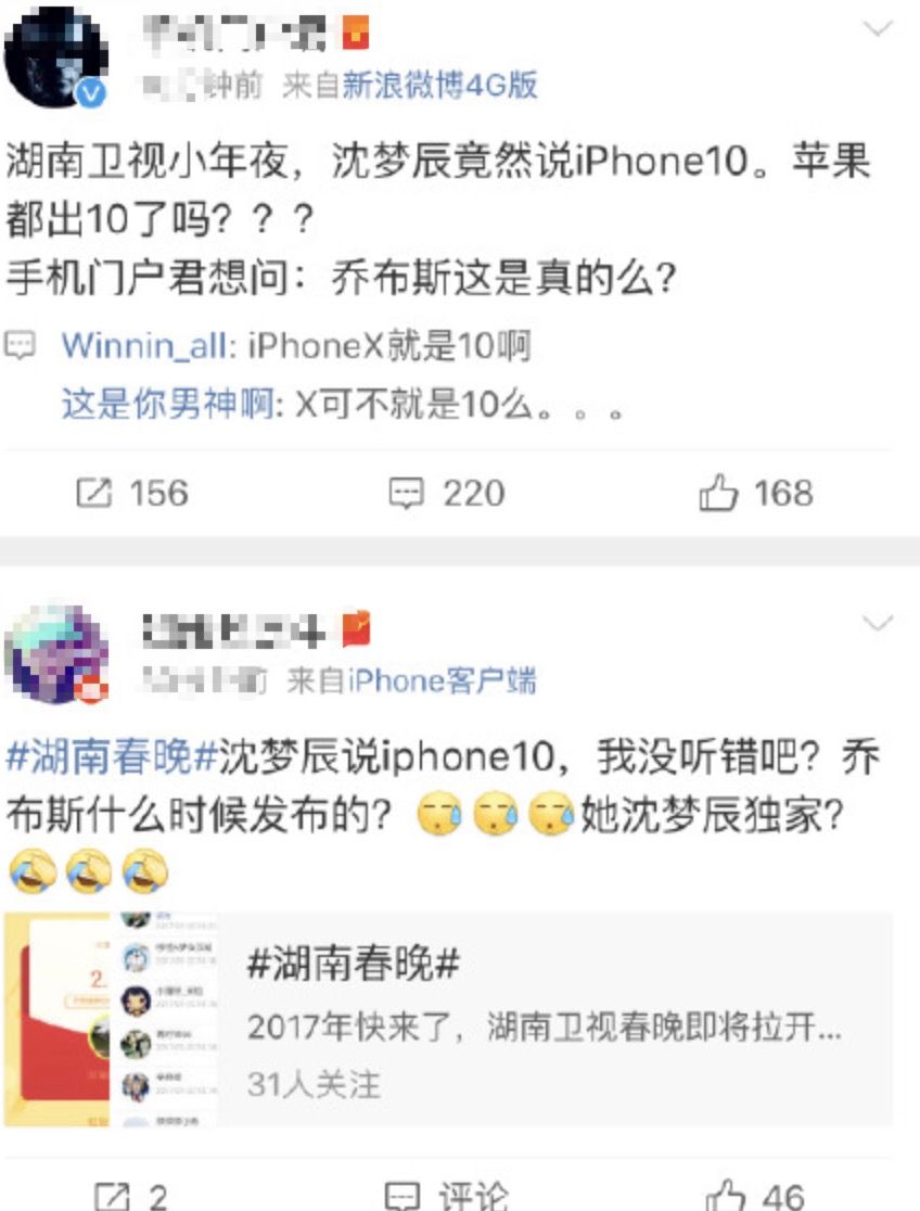 而另外,昨晚杜海涛的女友沈梦辰也不甘示弱,把iphoneX说成iphone10,引来不少网友吐槽。