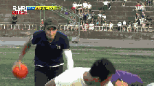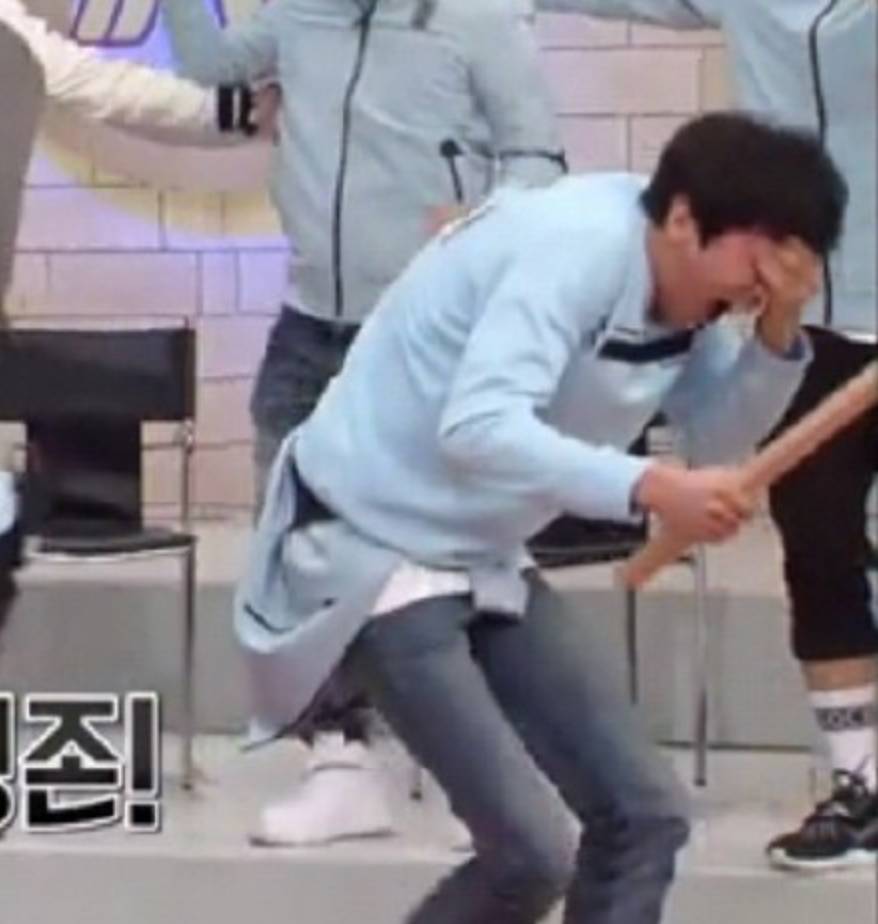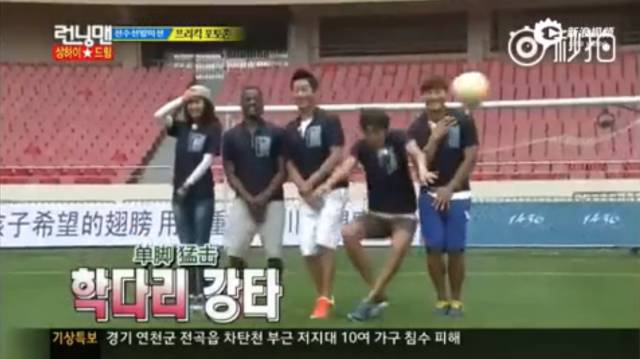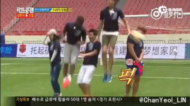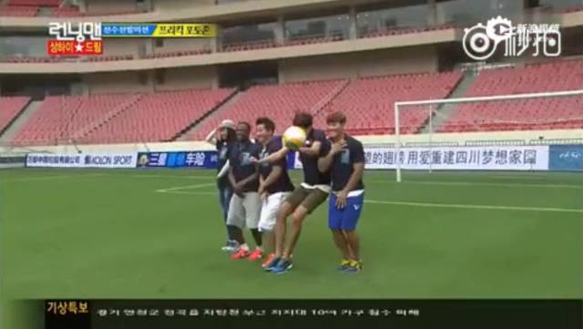 在一次游戏中,captain朴一脚射门,按理说跳得越高越安全,万万没想到,球正打在五个人里跳的最高的光洙身上!
