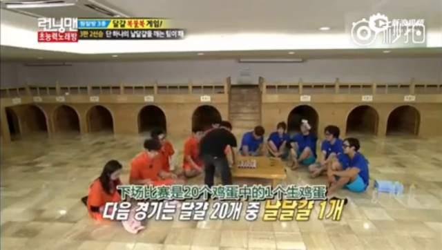 这一段是君君心目中最拜服的也是最难以置信的一次,成员们轮流在30个鸡蛋中随机挑选一个砸到脑袋上,看谁最倒霉会挑选到唯一一个生鸡蛋。