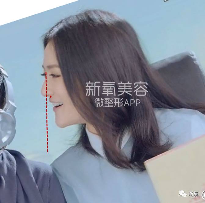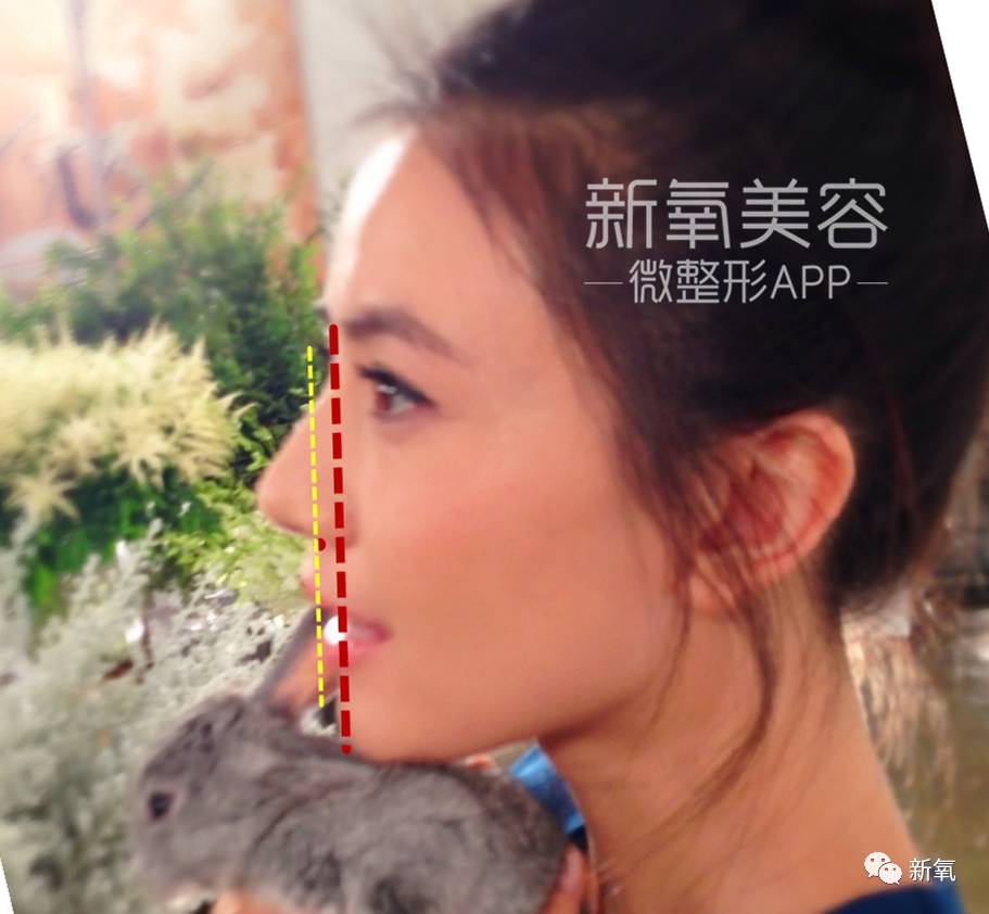 高圆圆也是鼻下点在山根垂直线的外侧。(本来想用两根线表示,发现不如红点清晰)