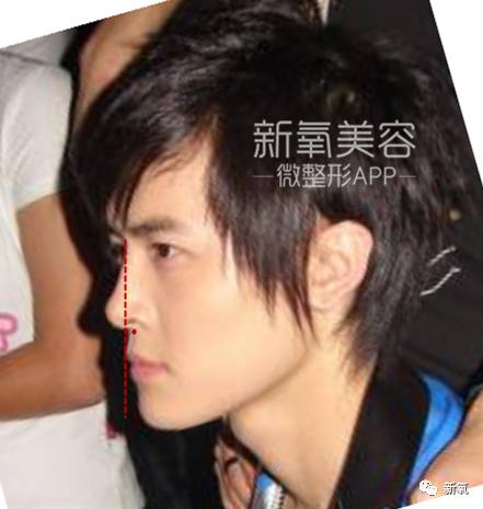 我们通过山根做一条垂直于水平线的虚线,然后在鼻唇角的拐点处标出鼻下点,可以看到张国荣的侧面,鼻下点在山根垂直线的外侧。