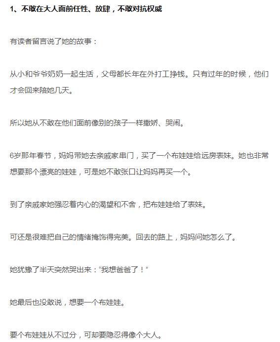 另一种成长于不顺心的家庭环境中,父母过于软弱或是暴怒。这样的孩子看起来温顺懂事,实则内心有泪不敢流,有话不敢说,习惯于压抑自己的内心。