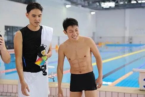 冷不丁地把坐在泳池旁的小岳岳踹下水,然后大笑起来。