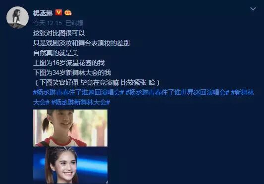 就在刚刚,杨丞琳在自己微博上传一张照片,并配文称:“这张对比图很可以,只是戏剧淡妆和舞台表演妆的差别。自然真的就是美!(下图笑容好僵!毕竟在竞演嘛,比较紧张,哈!)”