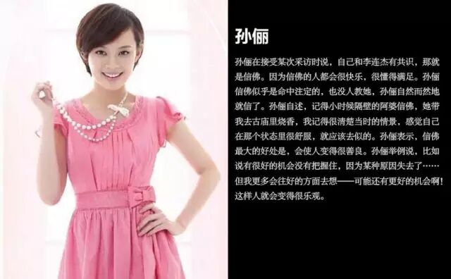 孙俪在接受某次采访时说,自己和李连杰有共识,那就是信佛。因为信佛的人都会很快乐,很懂得满足。孙俪信佛似乎是命中注定的,也没人教她,孙俪自然而然地就信了。