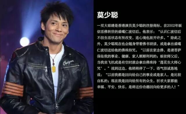 一双大眼睛是香港演员莫少聪的注册商标,在2002年皈依活佛转世的盛噶仁波切后。他表示:“认识仁波切不但生活状态有所改变,连心境也放开许多。