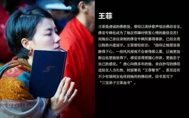 王菲曾经坦言:“信仰让她更容易静得下心,一些风风雨雨不会看得那么重,让她更加豁达也更能放得下,感觉活得更随心所欲,更能忠于自己的感觉”。