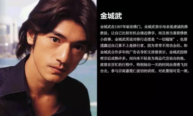 金城武在1997年皈依佛门,金城武表示母亲是虔诚的佛教徒,让自己比较有机会接近佛学,而且相当喜爱佛教小故事,金城武笑着说修行态度是“一切随缘”,也曾透露过自己算不上是修行者,因为常常不用功念经。