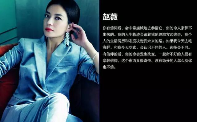 赵薇:你有信仰后,会非常虔诚地去参悟它,你的命人家算不出来的。我的人生轨迹会跟着我的思维方式去走,我个人的生活阅历和态度决定我未来的路。如果我今天去吃海鲜,和我今天吃素,会认识不同的人,选择会不同。