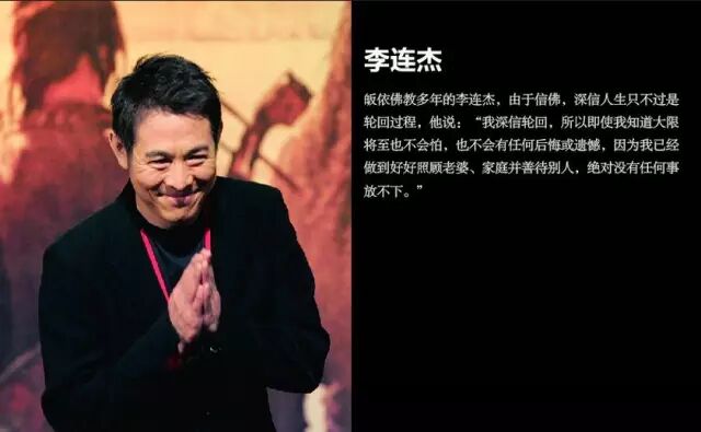 信佛多年的李连杰说:“我深信轮回,所以即使我知道大限将至也不会怕,也不会有任何后悔或遗憾,因为我已经做到好好照顾老婆、家庭并善待别人,绝对没有任何事放不下”。