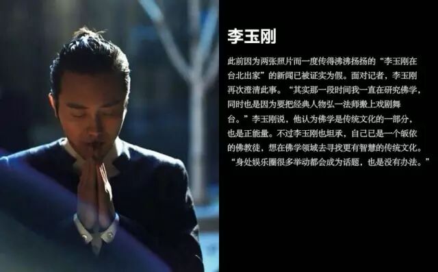 李玉刚说:“我认为佛学是传统文化的一部分,也是正能量。”不过李玉刚也坦承,自己是一名皈依的佛教徒,想在佛学领域去寻找更有智慧的传统文化。“身处娱乐圈很多举动都会成为话题,也是没有办法”。