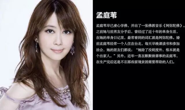 孟庭苇早已虔心学佛,并出了一张佛教音乐《阿弥陀佛》。之前她与前男友分手后,曾经过了近十年的单身生活,在她的单身日记里,最常看到的词汇就是阿弥陀佛。她的朋友们都说:“她除了没剃度外,根本就是个出家人”。