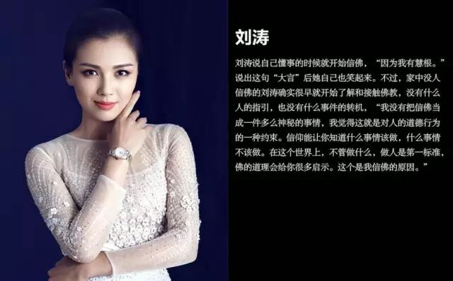 刘涛曾坦言:“我没有把信佛当成一件多么神秘的事情,我觉得这就是对人的道德行为的一种约束。信仰能让你知道什么事情该做,什么事情不该做。在这个世界上,不管做什么,做人是第一标准,佛的道理会给你很多启示。这个是我信佛的原因”。