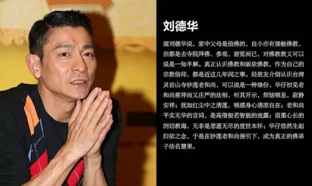 刘德华说:“家中父母是信佛的,自小亦有接触佛教。”经朋友介绍认识台湾灵岩山寺妙莲老和尚,华仔初见老和尚慈祥而又庄严的法相,听其开示,烦恼顿息,寂静安祥;犹如红尘中之青莲,顿感身心清凉自在,于是在妙莲老和尚接引下,成为真正的佛弟子法名慧果。