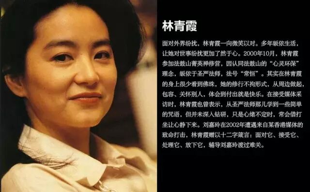 面对外界纷扰,林青霞一向微笑以对。多年皈依生活,让她对世事纷扰更加了然于心。林青霞也曾表示,从圣严法师那儿学到一些简单的咒语,但并未深入钻研,只是心绪不定时,常会借打坐让心静下来。