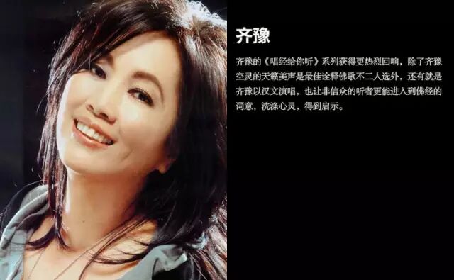 齐豫的《唱经给你听》系列获得更热烈回响,除了齐豫空灵的天籁美声是最佳诠释佛歌不二人选外,还有就是齐豫以汉文演唱,也让非信众的听者更能进入到佛经的词意,洗涤心灵,得到启示。