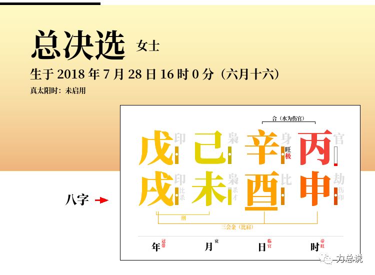 这一个八字,土、金相生,地支三会金局,官星又被身主合去,是一个强金的「专旺格」。——作为充满王道气息的总决选,它的时辰想必也是严格挑选过。