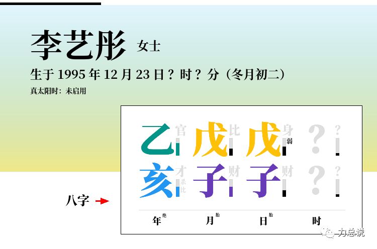 但李艺彤的八字里,就没有印星(至少前六字没有出现),甚至食伤也没有,而只是大运走到了「食神」。食神也与名声有关,但更多是指内容、作品,而不是作者本人的品牌。——所以,因为印星的缺席,李艺彤只能借 SNH48 的光环,靠连续推出作品来获得人气,而如果日后单飞,就很难成为持久出名的艺人(不是说不能出名,而是不容易出大名)。