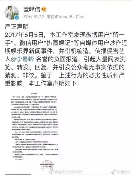 起因在于,2015年底,李易峰和某女星的绯闻开始在互联网上大规模发酵,双方工作室多次澄清、声明,并表示将进行法律维权。今年5月5日,李易峰工作室通过微博“壹峰信”发布声明,称微博博主“留一手”、微信用户“扒圈娱记”等发布了与以上内容有关信息,引起大量转发、猜测,影响极其恶劣,据此对于这些用户提出了严重警告,并要求其及时清除涉及侵权的内容。
