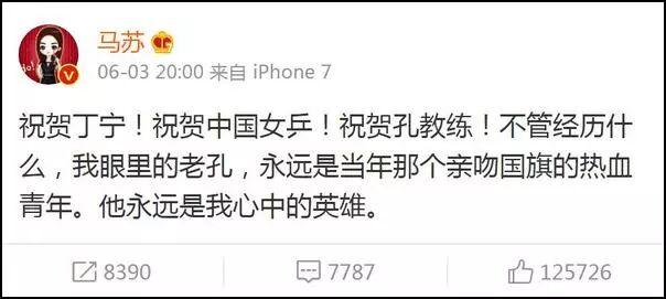 如今孔令辉摊上事儿回国接受调查,马苏隔空力挺,称“祝贺孔教练”,“永远是我心中的英雄”,也算是有情有义吧~