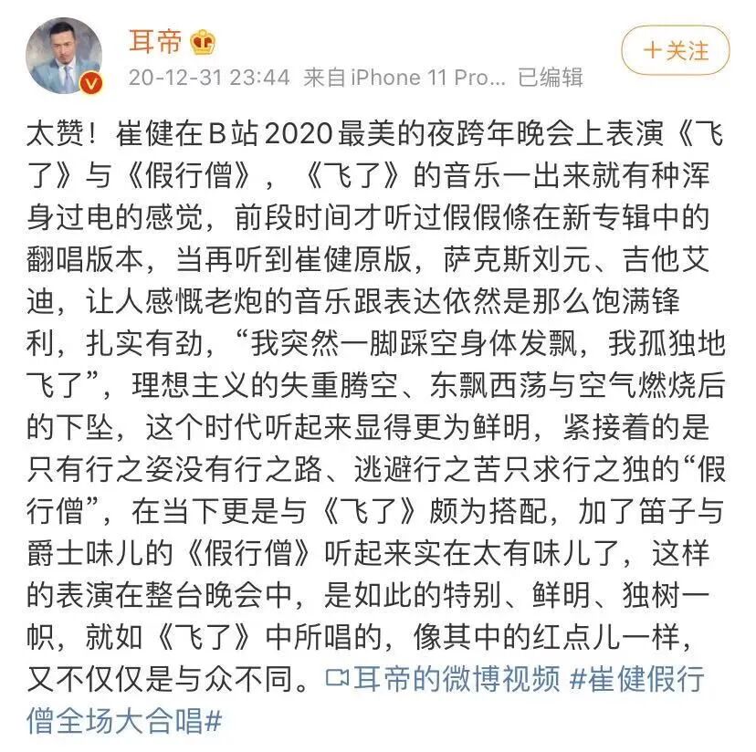 2020年12月31日,B站跨年晚会上,崔健又拿起了话筒。新年第一天,我看到网上有很多评论,很高兴在这个时代,人们还可以听到他的歌曲,他的声音。