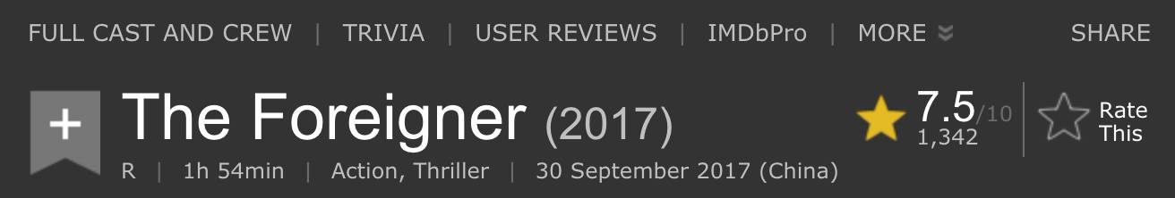 中文译名很容易让人联想到是“某某大战某某”,实则不然。它的英文名字《The Foreigner》更贴合电影原意。