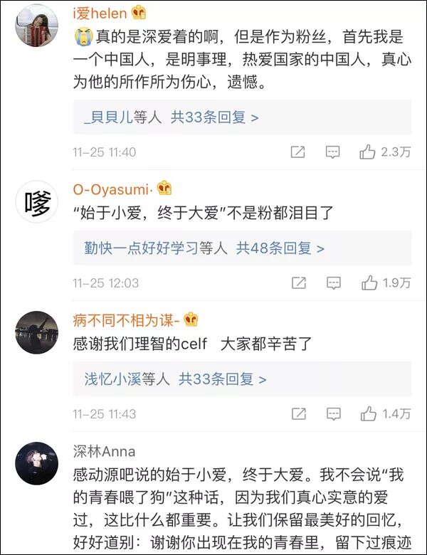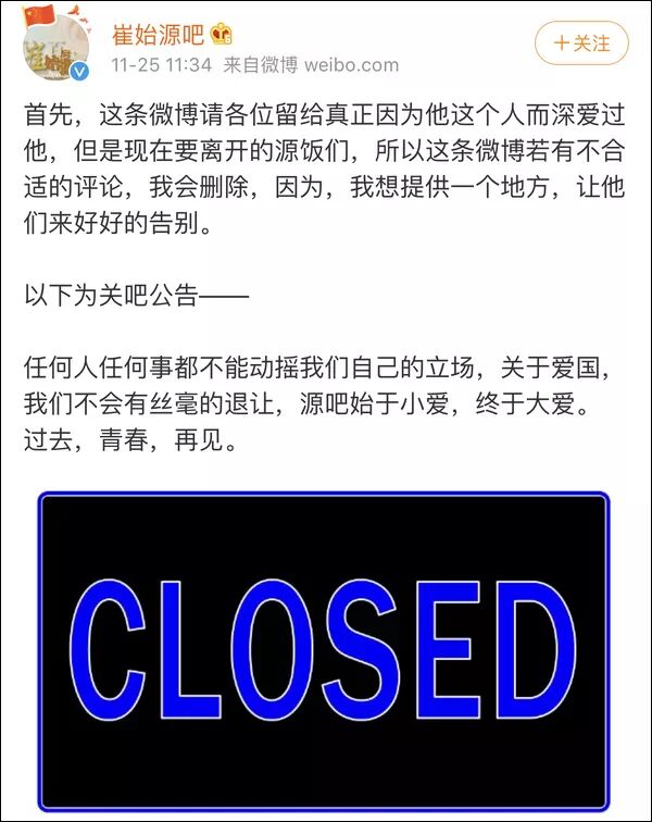 对比之下,百度崔始源吧官方微博宣布关吧的做法,获得诸多网友赞赏,评论区刷评“国家面前无偶像”等类似支持言论。