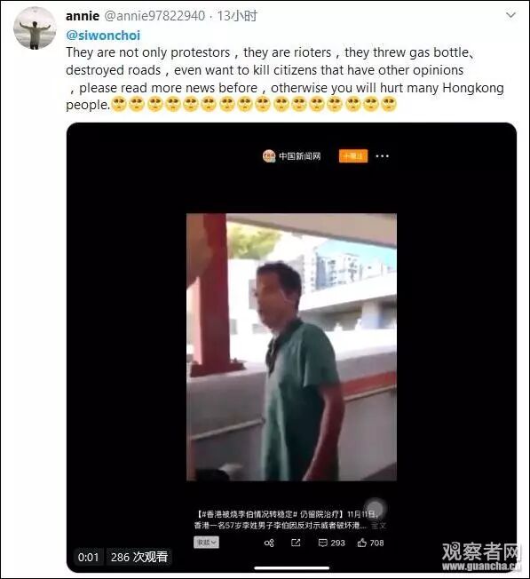 有人认为崔始源也许是被外媒片面报道所蒙骗,在海外社交媒体上不断@他,将暴徒对香港无辜民众和警方使用暴力的图片视频发送给他看,告诫其“不知全貌不予置评”。